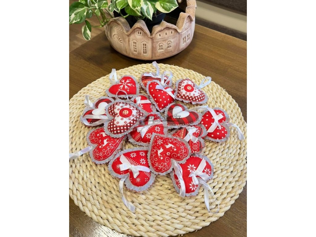 Hledáte drobnost, která zahřeje u srdce, nebo chcete u vás doma vytvořit útulnou atmosféru plnou pohody? Naše červená látková srdíčka jsou přesně tím detailem, který dokáže z obyčejného bytu vytvořit domov. Červená barva symbolizuje lásku a energii a v kombinaci s tradičními vzory působí velmi vkusně a nadčasově. Díky tradičním vzorům s vločkami a hvězdičkami jsou tato srdíčka nádhernou a nerozbitnou ozdobou na vánoční stromeček, adventní věnec nebo zimní větvičky ve váze.Tato srdíčka pro vás šijeme přímo u nás v naší rodinné dílně. Nejde o žádnou pásovou výrobu, každé srdíčko nám projde rukama. Zakládáme si na tom, že každý kus je originál.