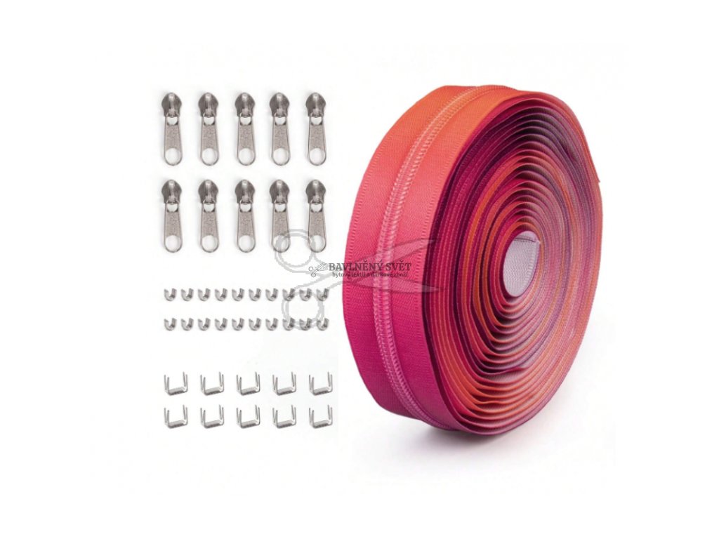 Tato sada je navržena pro všechny milovníky tvoření, kteří hledají profesionální a esteticky sladěné řešení pro své šicí projekty. Duhový efekt nylonové spirály plynule přechází v tónech sytě červené a růžové barvy, což dodá vašim výrobkům moderní a luxusní vzhled. Velkou výhodou této sady je její variabilita, díky které si zip snadno upravíte přesně na požadovanou délku. Výrobek je ideální pro šití kabelek, kosmetických taštiček, dekorativních polštářků a mnoha dalších doplňků. Součástí balení je také kovová koncovka, která slouží k bezpečnému uzavření zipu, aby z něj nevyjel jezdec. Její aplikace je velmi snadná, protože stačí pouze přimáčknout zoubky na zipu pomocí kleští.