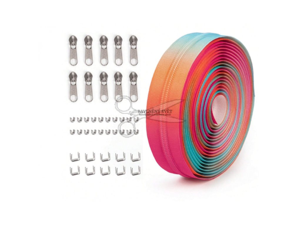 Tato oranžová sada je stvořena pro všechny, kteří chtějí svým výrobkům dodat energii a nepřehlédnutelný styl. Duhový efekt nylonové spirály plynule přechází mezi zářivou oranžovou, sytě růžovou a svěží tyrkysovou, což vytváří unikátní vizuální prvek, který povýší každý šicí projekt na designový kousek. Velkou výhodou této sady je její naprostá variabilita, díky které si tento kvalitní zip snadno upravíte přesně na délku, kterou váš projekt vyžaduje. Metráž vám umožní efektivně využít každý centimetr bez zbytečného odpadu. Tato energická barevná kombinace se skvěle hodí pro šití plážových tašek, dětských batůžků, veselých ledvinek nebo výrazných kosmetických taštiček.