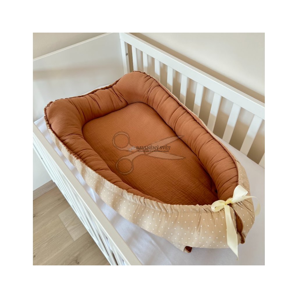 Zajistěte svému miminku to nejlepší pro jeho první měsíce života. Hnízdečko SÁRA v hnědém provedení je jedinečné díky využití mušelínu, který je proslulý svou prodyšností a hebkostí k citlivé dětské pokožce. Protože je hnízdečko oboustranné, můžete ho otáčet podle potřeby a měnit vzhled i povrchový materiál ložné plochy. Je navrženo pro děti od narození do cca 6 měsíců a účinně zabraňuje nechtěnému překulení miminka.