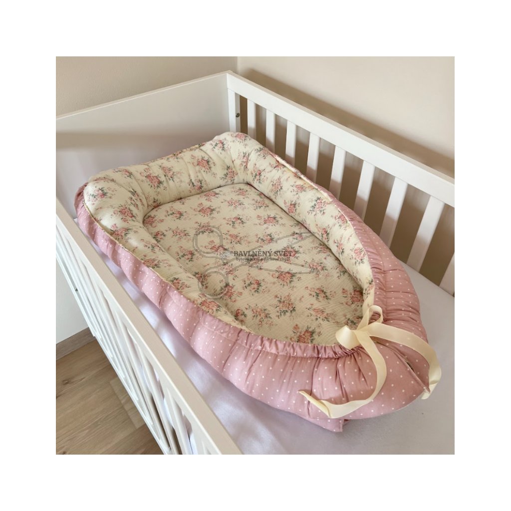 První měsíce života jsou o blízkosti, tichém dýchání a pocitu, že je svět v pořádku. S naším růžovým hnízdečkem SÁRA darujete své dcerce prostor, kde se bude cítit chráněná a v naprostém pohodlí. Kombinace klasického plátna s jemným puntíkem a nadýchaného mušelínu s drobnými kvítky je nejen nádherná na pohled, ale především neuvěřitelně hebká k dětské pokožce. Mušelín svou prodyšností zajistí, že se vaše holčička bude cítit jako v bavlnce, ať už odpočívá v postýlce, nebo sleduje svět z gauče u vás v obýváku.