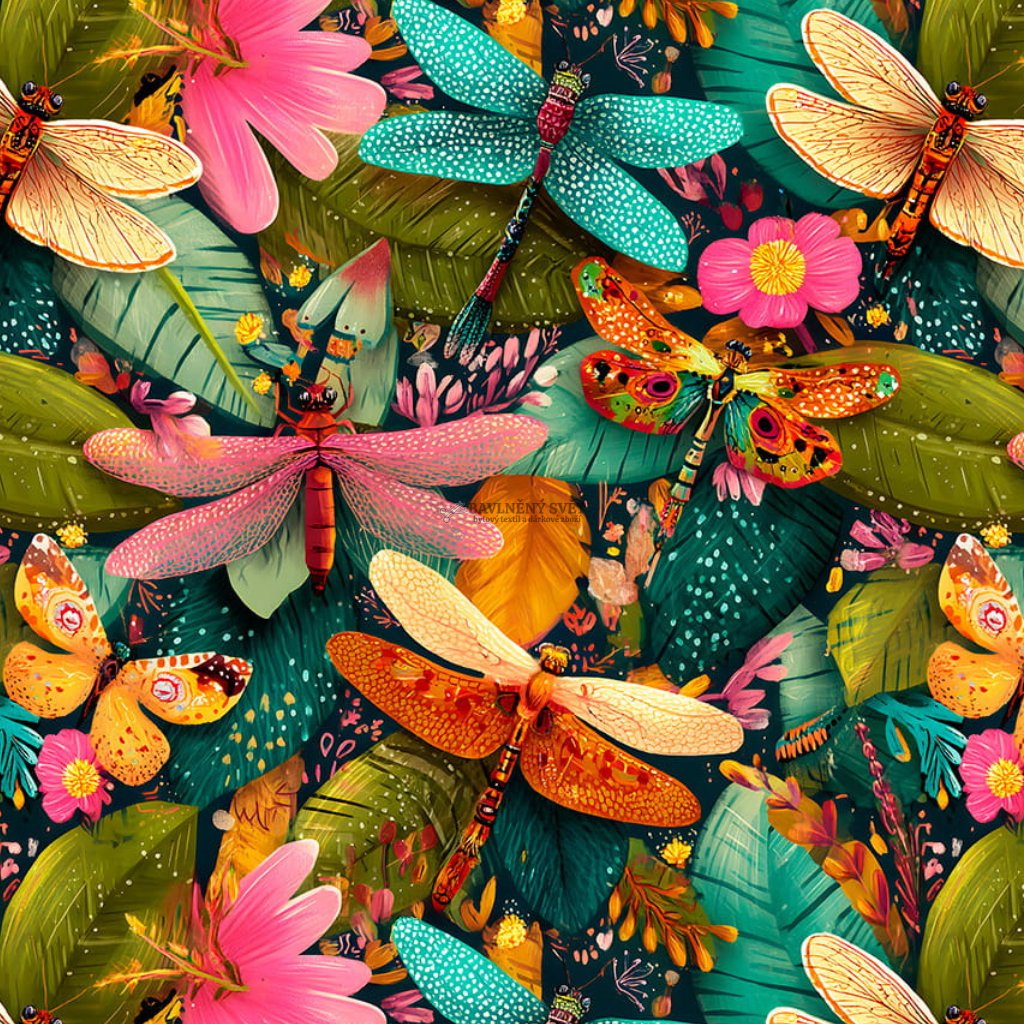 Vstupte do snového světa, kde ožívá příroda v těch nejkrásnějších barvách. Kombinace smaragdové, sytě růžové a zlatavých odlesků na křídlech vážek vytváří hloubku, která vás prostě nepustí. Je to kočárkovina, která v sobě spojuje křehkost umění a nekompromisní technickou odolnost. Má speciální zátěr, po kterém kapky deště jen neškodně stečou, takže vaše věci zůstanou v naprostém suchu i během letní bouřky.