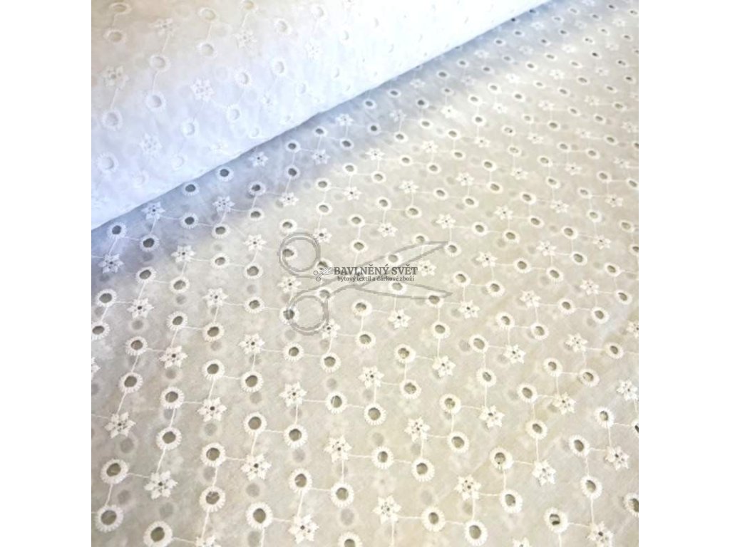 Doporučená údržba: Aby si dírková výšivka zachovala svůj tvar a krásu, doporučujeme prát na 30 °C. Látku nesmíme bělit ani sušit v bubnové sušičce, aby nedošlo k poškození jemných vláken. Nezapomeňte látku před šitím důkladně vysrážet, protože 100% bavlna má přirozenou srážlivost. Žehlete na stupeň bavlna, ideálně s použitím páry, která krásně vyrovná strukturu výšivky.