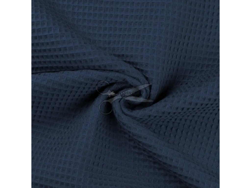 Tento vaflový materiál v barvě tmavá jeans přináší do vaší tvorby eleganci spojenou s maximálním uživatelským komfortem. Látka je vyrobena ze 100% bavlny vysoké kvality, jejíž speciální vazba vytváří hlubokou vaflovou strukturu, která efektivně odvádí vlhkost a zároveň je velmi prodyšná a příjemná na dotek.
