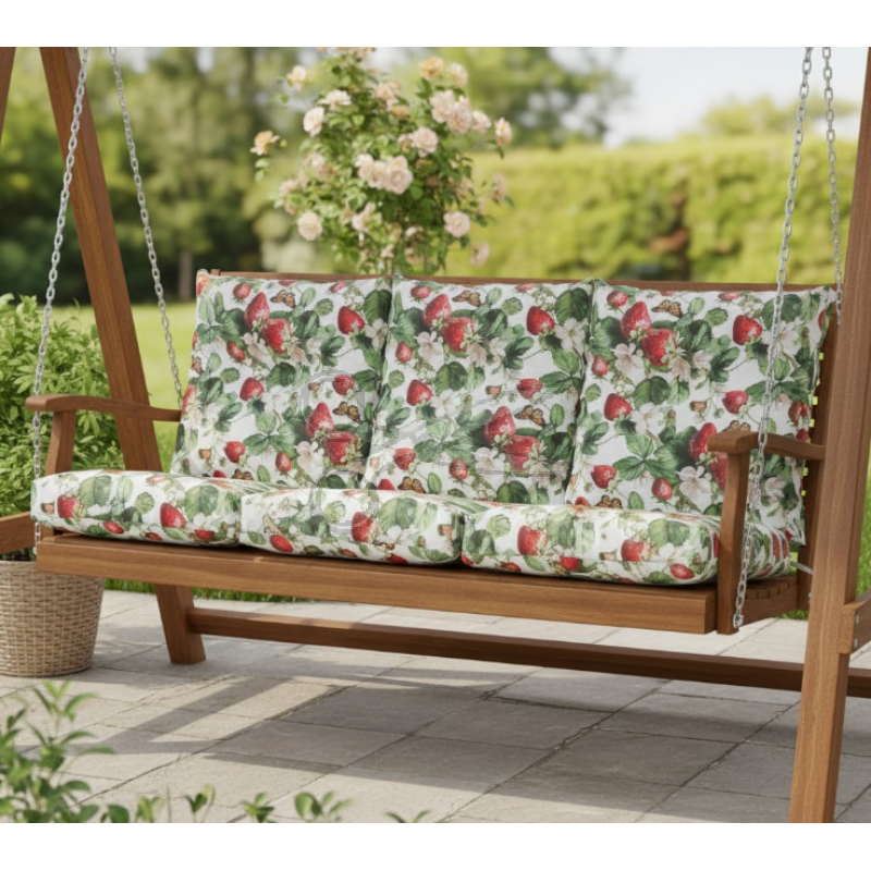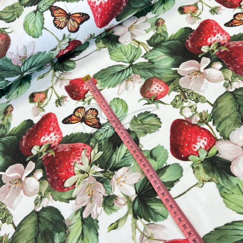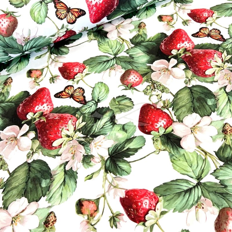 Voděodolná dekorační látka s realistickým motivem jahod a motýlů na bílém podkladu. Tato jednostranná látka je díky své odolnosti vůči vodě a nečistotám ideální pro výrobu zahradních ubrusů, sedáků, batohů a dalšího outdoorového textilu.