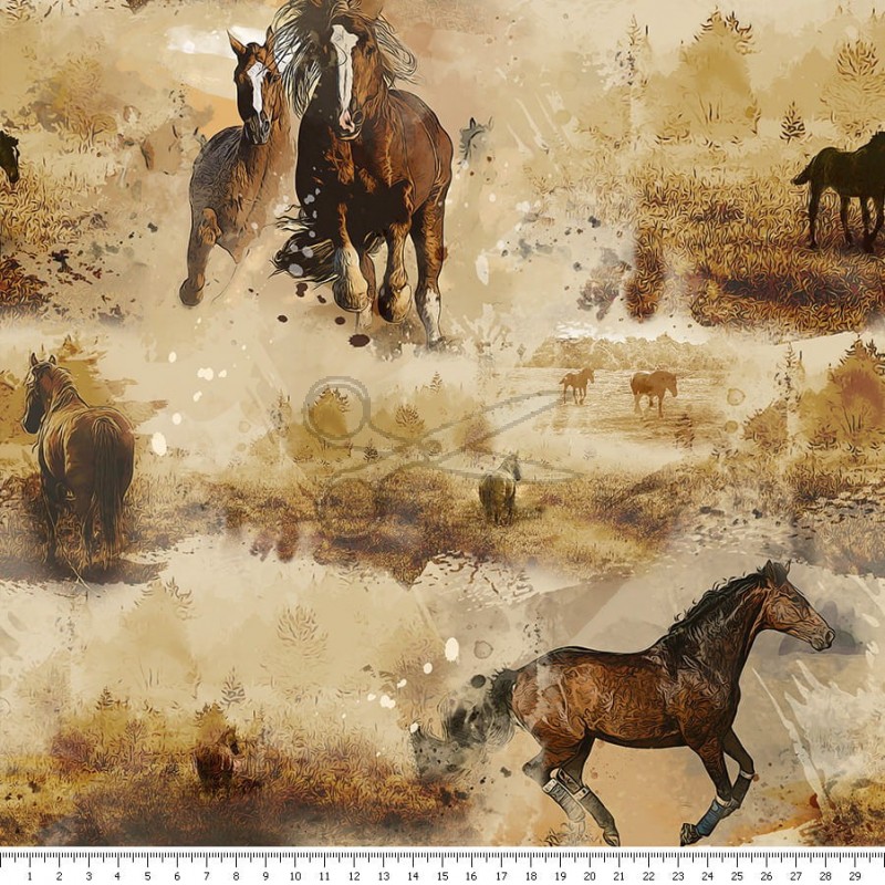 Koně na hnědém podkladě udělají velkou radost všem koňákům. Má hydrofóbní úpravu, není tedy zcela nepromokavá – impregnovaná.