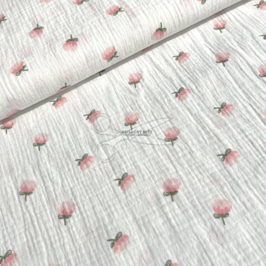Mušelín dvojitá gázovina RŮŽIČKY drobné šíře 140 cm