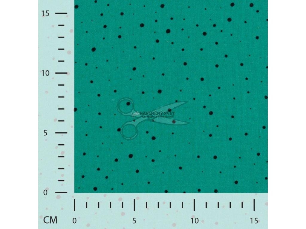 Mentolová dvojitá gázovina s klasickým vzorem černých puntíků v sobě skrývá překvapení v podobě jemného třpytu. Ačkoliv je efekt na první pohled decentní, při dopadu slunečních paprsků se látka krásně rozzáří a získá luxusní, třpytivý nádech. Materiál tvoří dvě vrstvy 100% bavlny, které zajišťují, že je látka neuvěřitelně lehká, savá a příjemná na tělo i v tom nejteplejším počasí.