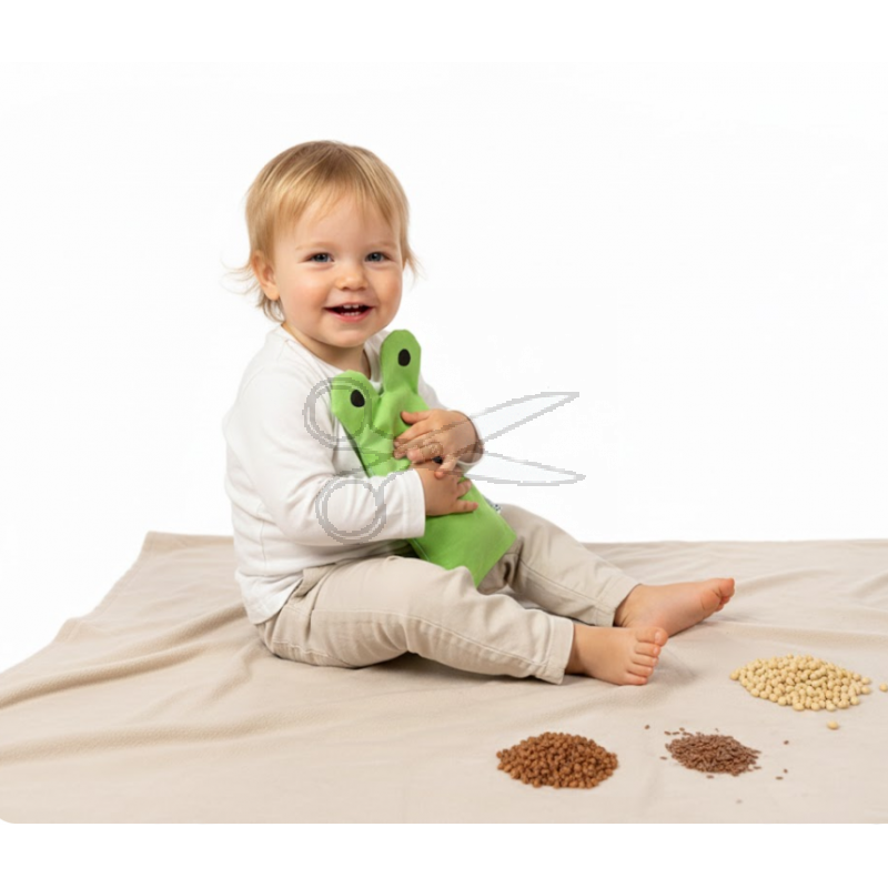 Hravý smyslový zážitek: Pecky uvnitř polštářku při pohybu jemně "hrkají", což děti baví a uklidňuje. Tvar žabky odpoutá pozornost od bolesti a pomůže dítěti se uvolnit.