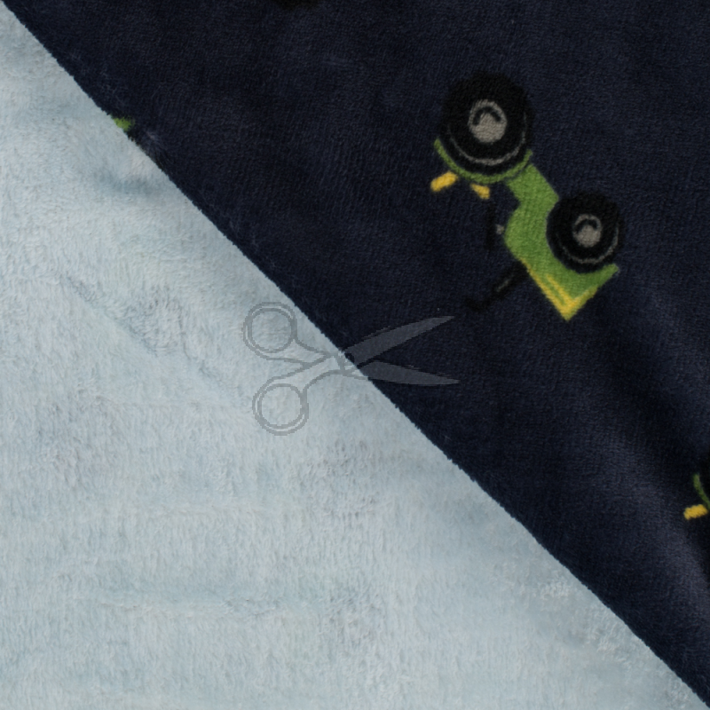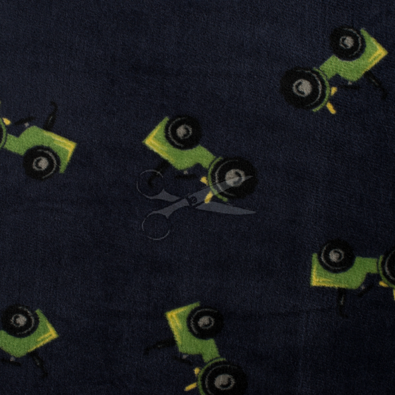 Flanel fleece – wellsoft  s příjemných vlasem z  jedné strany vzor traktor na modrém a z druhé strany jednobarevně modrý.