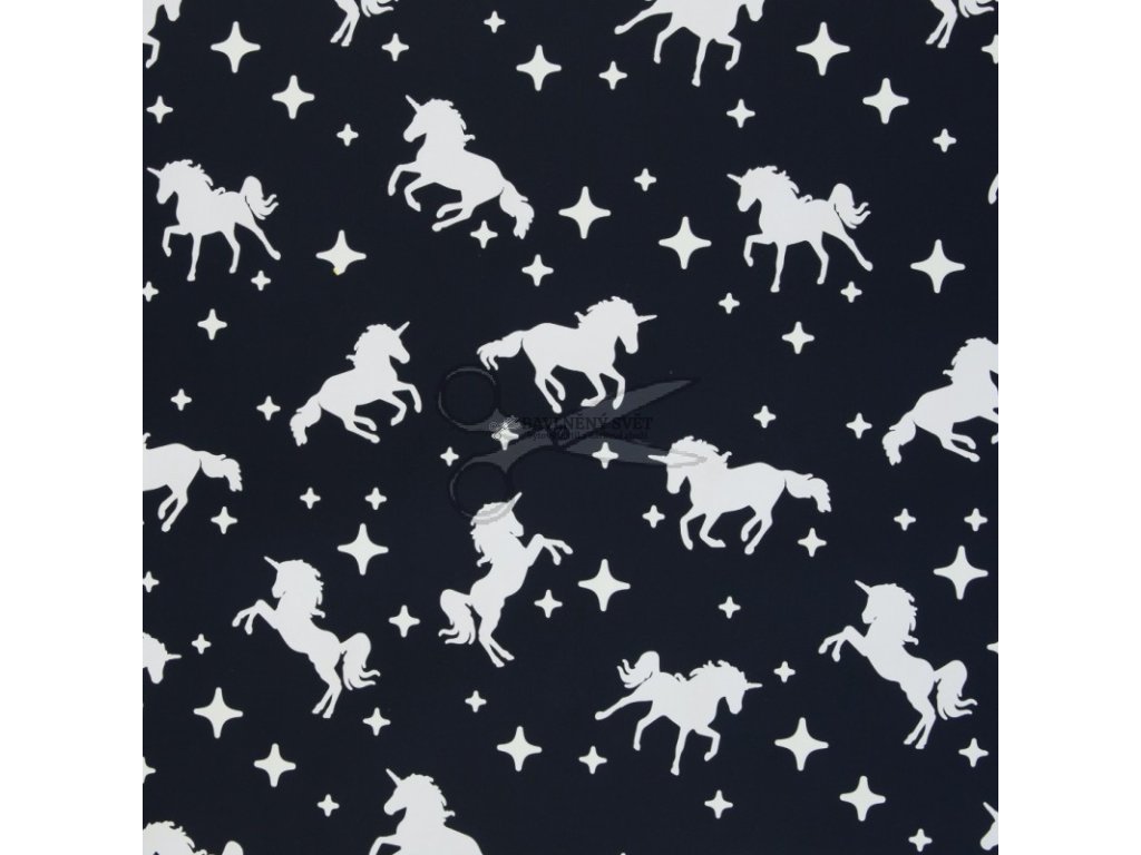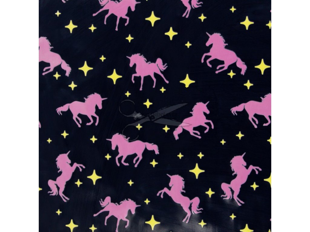 Proměňte deštivé počasí v zábavu! Tato funkční pláštěnkovina s motivem bílých jednorožců na tmavém podkladu v sobě skrývá překvapení – jakmile na ni dopadnou kapky vody, vzor začne měnit barvu. Po uschnutí se barvy opět vrátí do původního stavu. Je to ideální materiál pro všechny, kteří chtějí spojit praktičnost s hravým designem.