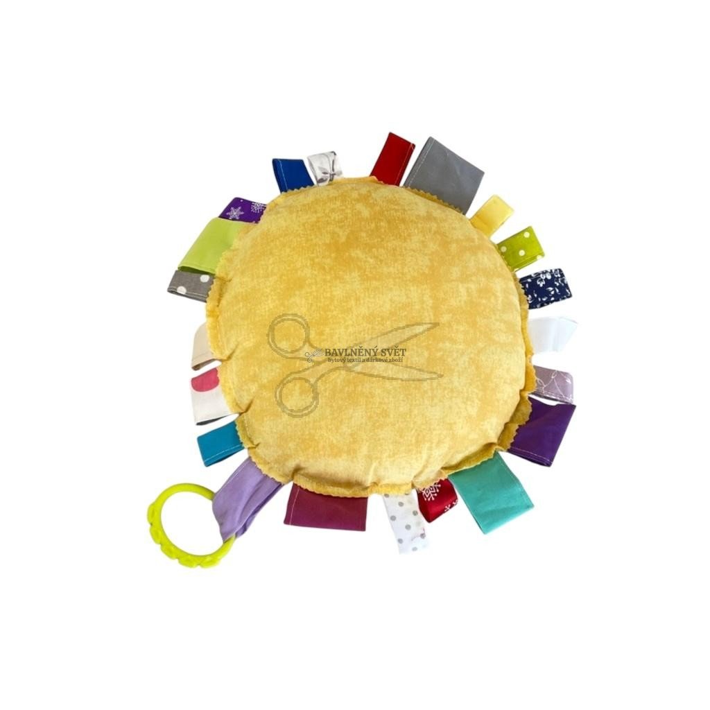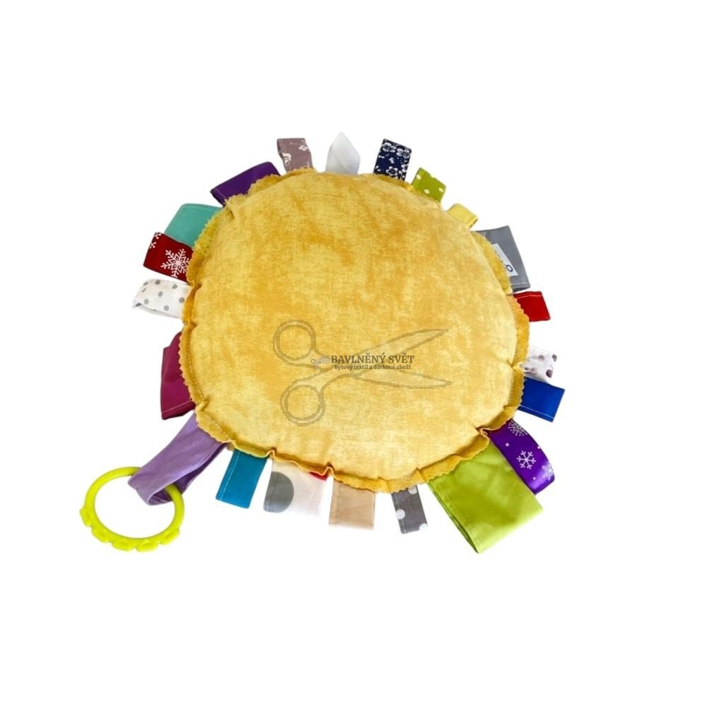 Naše sluníčko je stvořeno pro velké objetí i první objevování. Po celém obvodu má pevně všitá pestrobarevná látková poutka, která představují veselé sluneční paprsky. Tato poutka mají různé délky a vzory, což děti motivuje k tahání a žmoulání, čímž si přirozeně procvičují jemnou motoriku a hmatové vnímání.