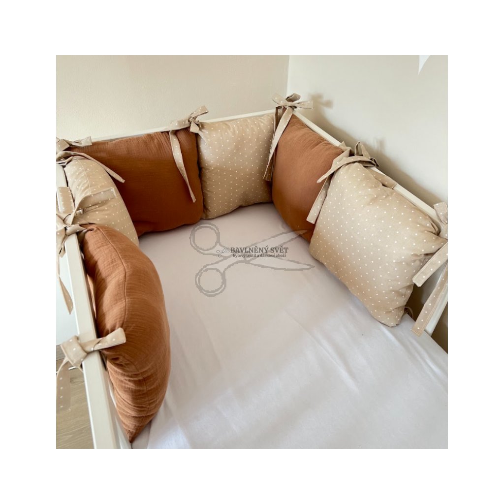 Hnědá varianta mantinelu SÁRA je ideální volbou pro rodiče, kteří hledají nadčasový design a maximální funkčnost. Díky využití prodyšného mušelínu polštářky skvěle odvádějí teplo a miminko se v jejich blízkosti cítí velmi příjemně. Výhodou polštářkového systému je jeho nesmírná flexibilita – jednotlivé díly můžete v postýlce střídat nebo je později využít jako stylové dekorace v hracím koutku. V naší dílně Bavlněný svět si zakládáme na poctivém šití, aby vám mantinel sloužil dlouhá léta.