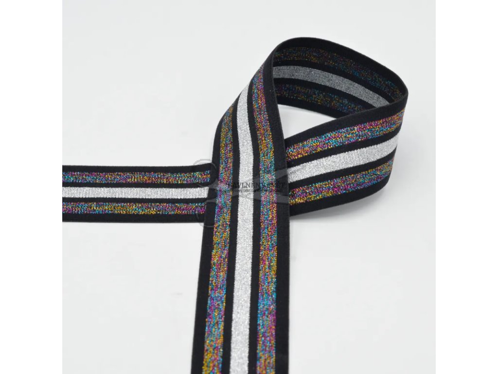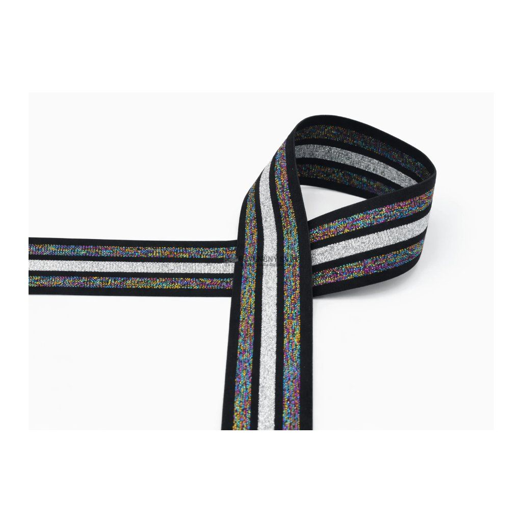 Tento typ ozdobné gumy si oblíbíte pro šití pasů u streetwearového oblečení, tanečních kostýmů nebo moderního spodního prádla. Materiál disponuje vynikající tvarovou pamětí, takže se po natažení vždy vrátí do původního stavu. Stříbrno-duhový prvek na černém podkladu dodává hotovému oblečení dynamiku a futuristický vzhled.