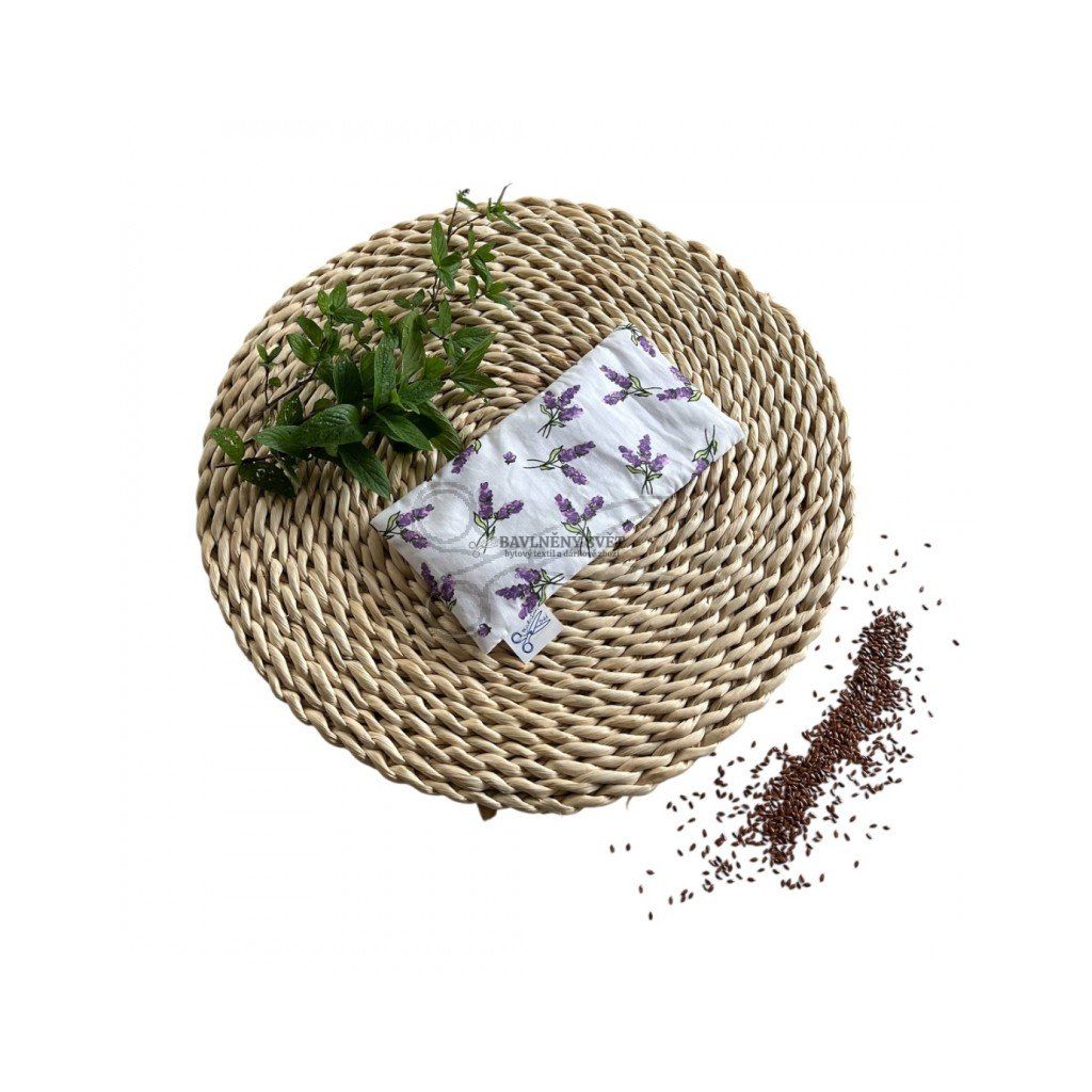 - Přírodní náplň z BIO lnu: Lněná semínka se jemně přizpůsobí tvaru obličeje, vytváří příjemný tlak a pomáhají uvolnit napětí v oblasti očí.