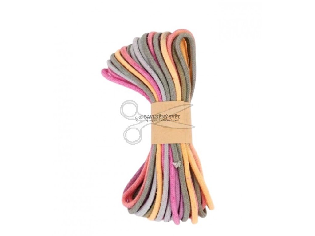 Tato duhová šňůra v sytých zemitých odstínech představuje inspirativní materiál pro všechny, kteří se nebojí barev a hledají cestu, jak ozvláštnit své šité či drhané projekty. Je vyrobena z vysoce kvalitních bavlněných vláken, která jsou velmi příjemná na dotek, což oceníte zejména u oděvních doplňků, jako jsou stahovací tkanice u mikin nebo sportovních kalhot. Barevné přechody mezi cihlovou a olivovou barvou vytvářejí na hotovém oblečení luxusní a neokoukaný prvek, který zaujme na první pohled.