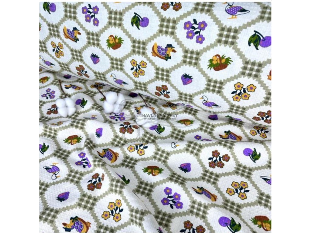 Toto vaflové piké v zeleném tónu s motivem kačenek a zahradního ovoce vnese do vaší kuchyně hravost a přírodní svěžest. Materiál je vyroben ze 100% bavlny s nízkým reliéfem, který postrádá typickou hlubokou strukturu klasických vaflí. Povrch látky zůstává hladší a kompaktnější, což zaručuje, že barevný potisk je velmi detailní a na materiálu krásně vynikne.
