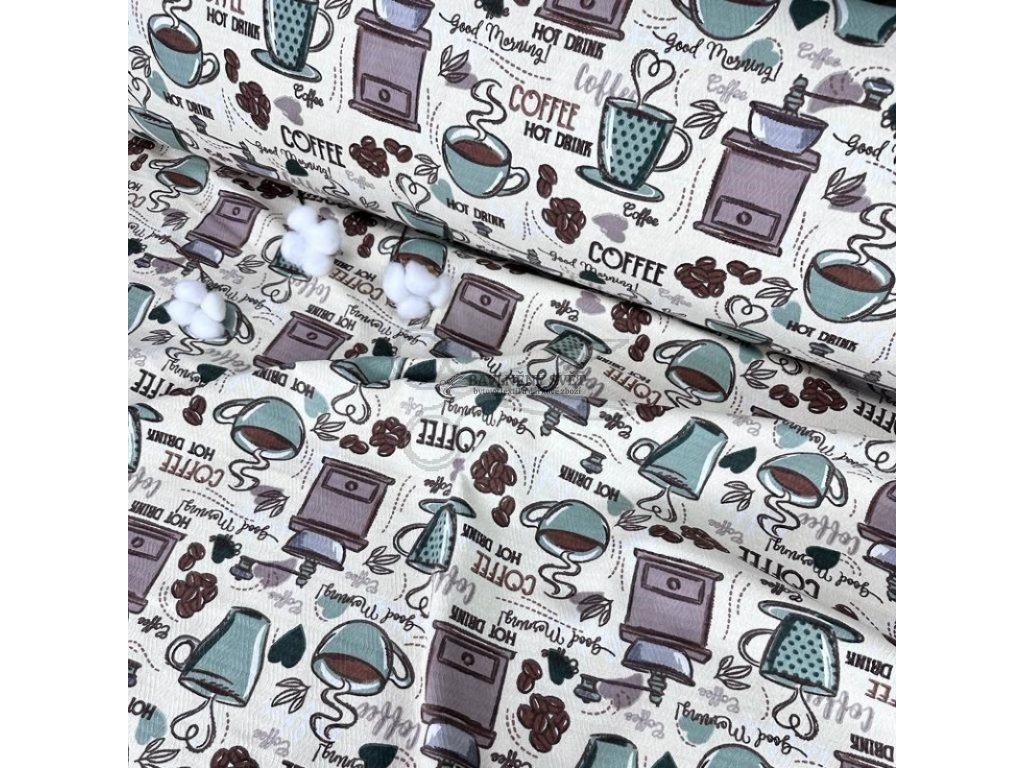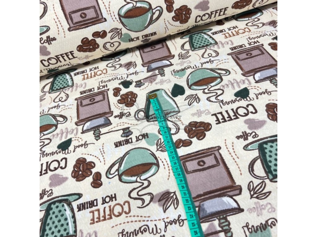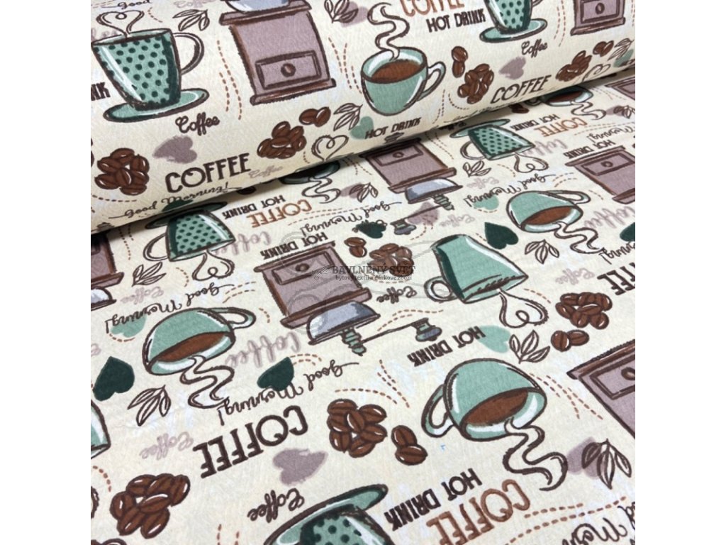 Toto vaflové piké s potiskem kávových motivů v moderní mintové barvě přináší do interiéru svěžest a vysokou funkčnost. Materiál je vyroben ze 100% bavlny s nízkým reliéfem, což znamená, že povrch látky je oproti klasické vaflovině plochý a kompaktní. Právě tato hladší struktura dovoluje, aby detailní vzor s kávovými zrny a šálky na materiálu krásně vynikl a zůstal barevně stálý.