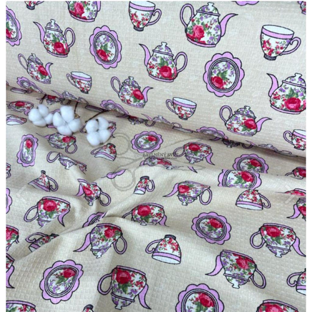 Dopřejte své kuchyni nádech romantické elegance s vaflovým piké se vzorem porcelánu v jemném růžovém odstínu na krémovém podkladu. Látka je vyrobena ze 100 % bavlny a má nízký, kompaktní reliéf, díky kterému působí hladším a uhlazenějším dojmem než klasická vaflovina. Ornamentální motiv inspirovaný tradičním porcelánem tak krásně vyniká a dodává látce jemně dekorativní charakter.