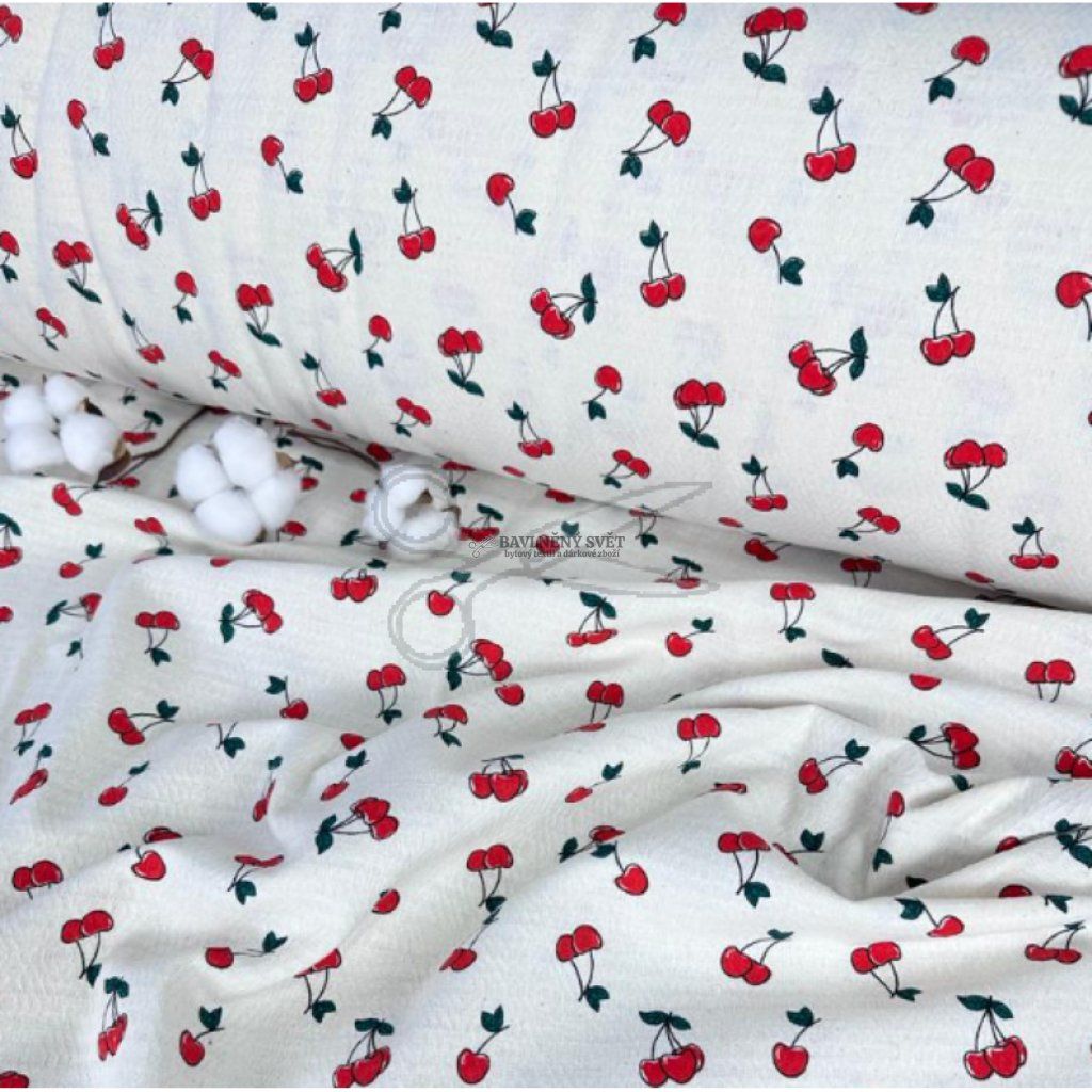 Toto vaflové piké s drobnými třešněmi na světlém podkladu působí jemně, hravě a zároveň elegantně. Látka je vyrobena ze 100 % bavlny a má nízký, kompaktní reliéf, díky kterému je hladší a tvarově stabilnější než klasická hluboká vaflovina. Drobně opakující se motiv třešní krásně vyniká a dodává látce svěží letní charakter.