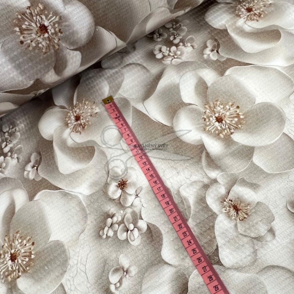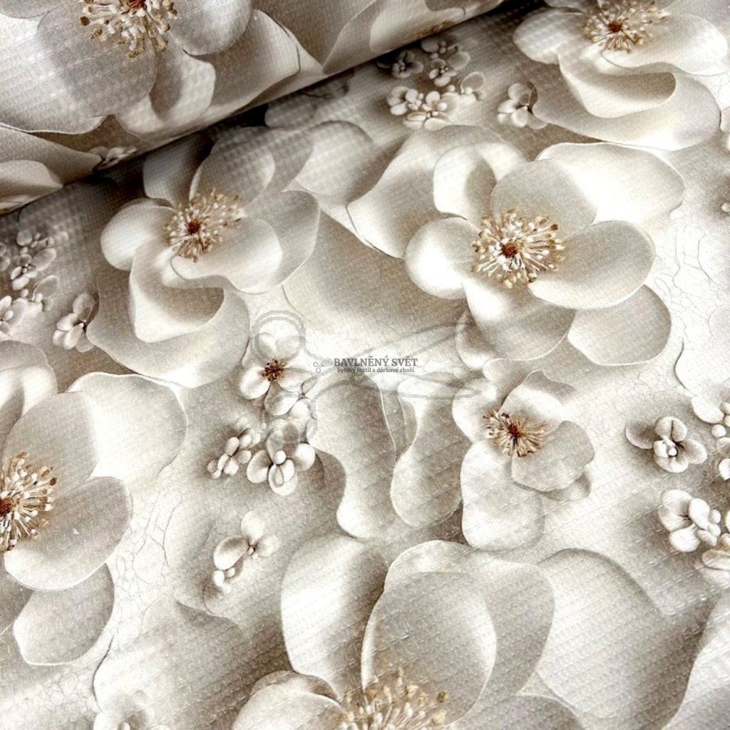Toto bavlněné vaflové piké představuje špičku v oblasti dekorativního textilu díky spojení tradiční 3D struktury a pokročilé technologie digitálního tisku. Specifická vazba, kde se střídají větší a menší vaflové buňky, dodává látce mimořádný objem a nadýchanost, která se plně rozvine po prvním vyprání. Dominantním prvkem je umělecký motiv květů, jejichž barevnost se pohybuje na pomezí smetanové až béžové barvy. Tento jemný barevný přechod vytváří hluboký vizuální efekt, který je v reálu ještě působivější než na fotografiích.