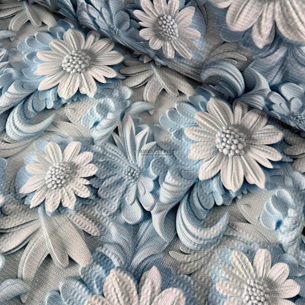 Toto bavlněné vaflové piké představuje dokonalou harmonii mezi funkčností a moderní estetikou díky spojení tradiční 3D struktury a pokročilé technologie digitálního tisku. Specifická vazba, kde se střídají větší a menší vaflové buňky, dodává látce výjimečný objem a nadýchanost, která se plně rozvine po prvním vyprání. Dominantním prvkem je motiv květů v ledově modré barvě, jejichž jemné stínování a detailní vykreslení vytvářejí hluboký vizuální efekt, který působí velmi luxusně.