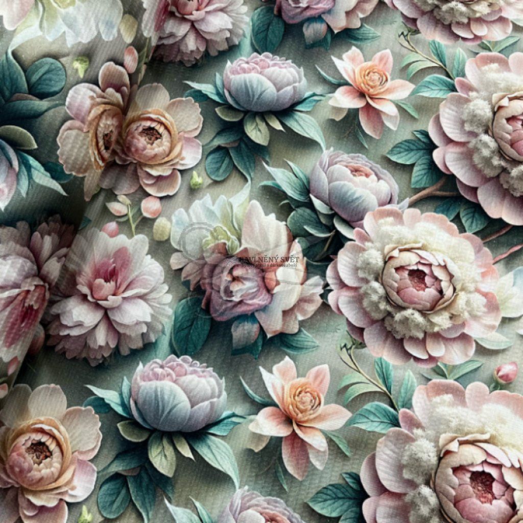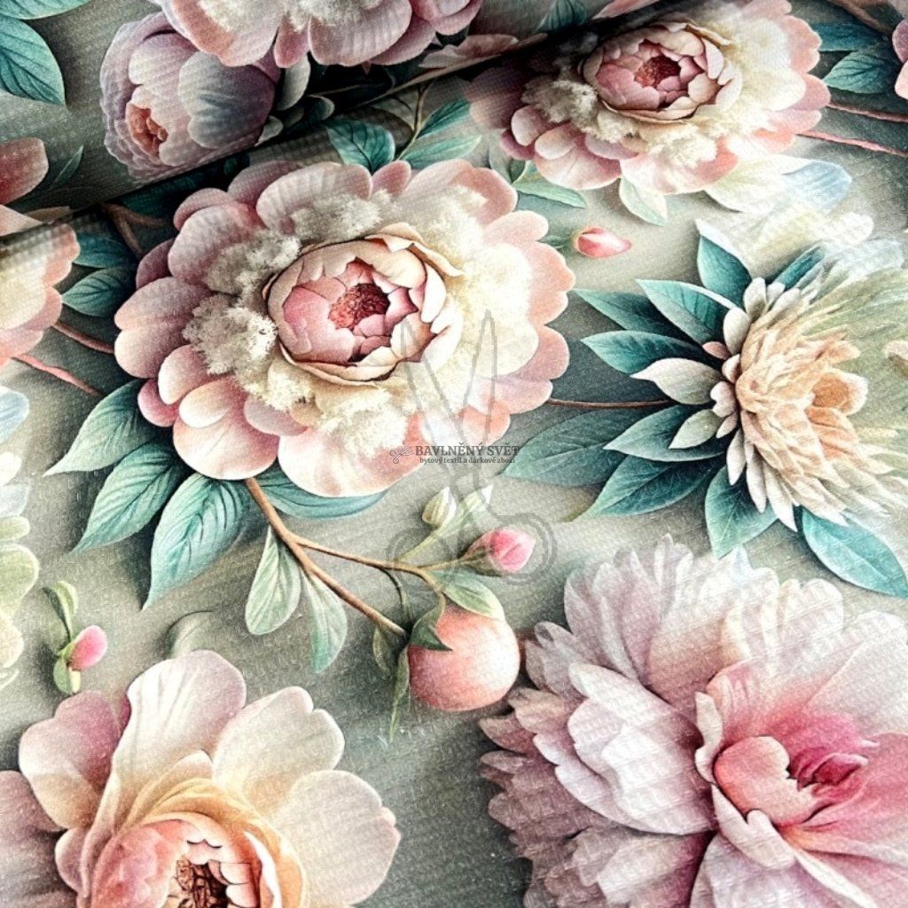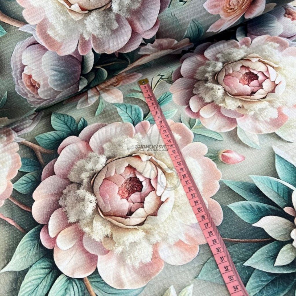 Toto bavlněné vaflové piké představuje dokonalou harmonii mezi tradičním řemeslem a moderní estetikou. Specifická plastická vazba, pro kterou je typické střídání větších a menších vaflových buněk, dodává látce mimořádný objem, měkkost a nadýchanost, která se naplno rozvine po prvním vyprání. Dominantním prvkem je detailní digitální tisk pivoněk, jejichž realistické provedení a jemné barevné přechody vytvářejí hluboký vizuální efekt.