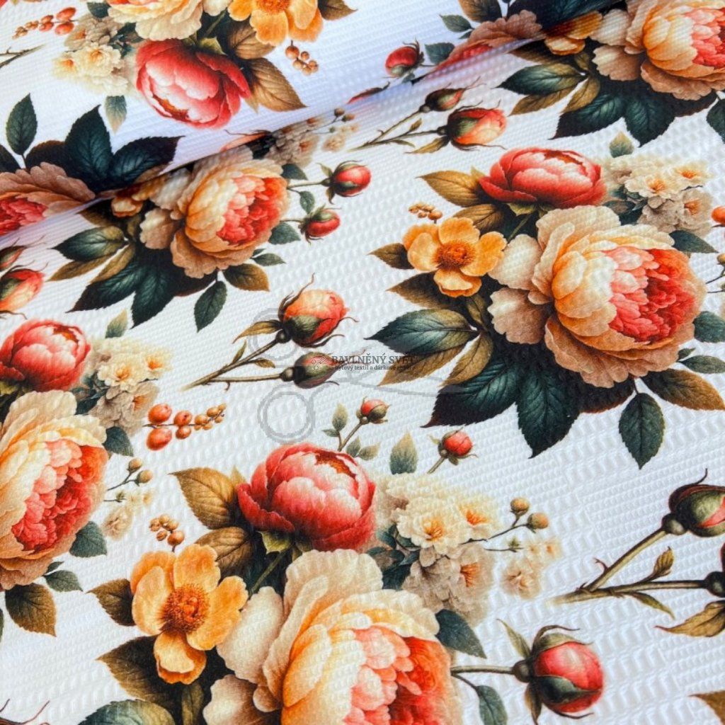 Toto vaflové piké s hlubokou 3D strukturou představuje dokonalou volbu pro milovníky výrazných květinových motivů a přírodních materiálů. Dominantním prvkem je detailní digitální tisk pivoněk v sytých oranžových tónech, které v kombinaci se zelenými listy na světlém podkladu působí velmi energicky a svěže. Plastická vazba, tvořená střídáním větších a menších buněk, dodává materiálu výjimečný objem a měkkost, která se po prvním vyprání ještě více zvýrazní.