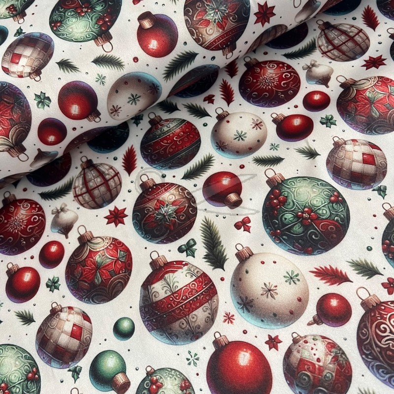 metráž - Dekorační VÁNOČNÍ satén - KOULE barevné š.150cm