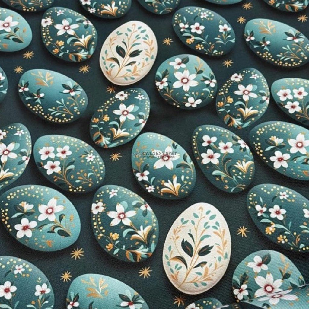 Voděodolná dekorační metráž VELIKONOČNÍ VAJÍČKA na PETROLEJOVÉM šíře 180 cm