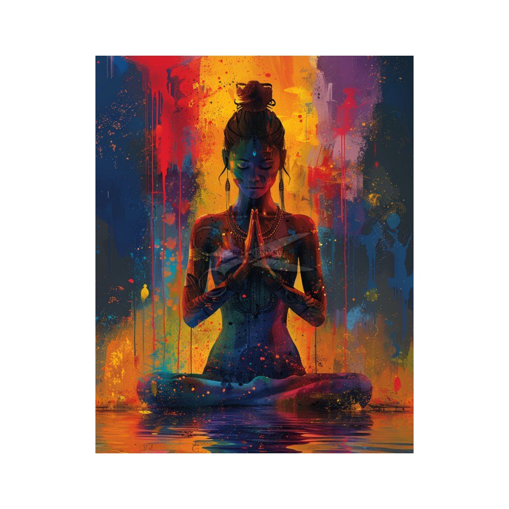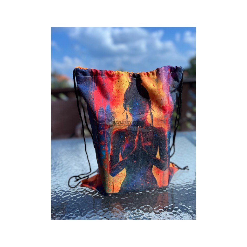 Dopřejte si kousek umění, který můžete nosit na zádech. Tento autorský vak z naší produkce kombinuje hloubku meditace s dynamikou barev. Je navržen tak, aby byl dostatečně objemný pro vaše oblečení na cvičení, ale zároveň zůstal lehký a skladný.