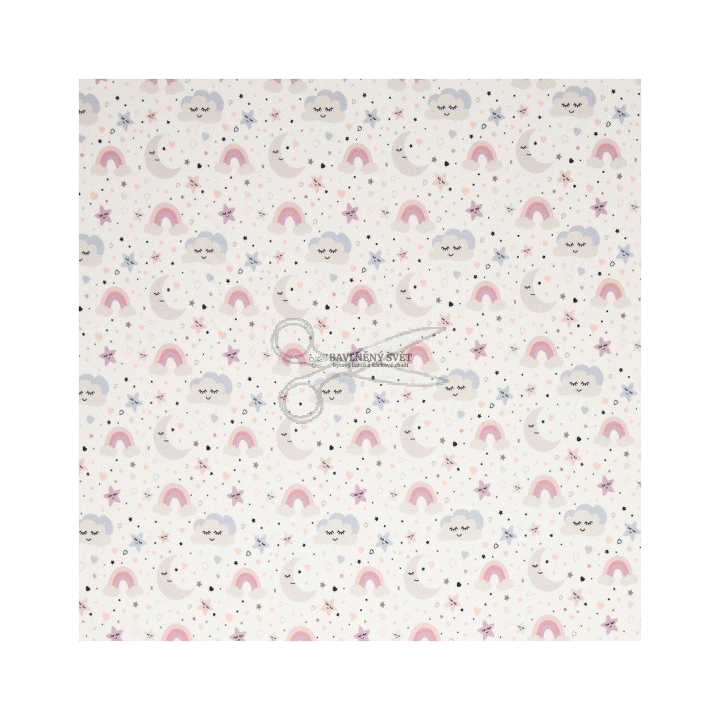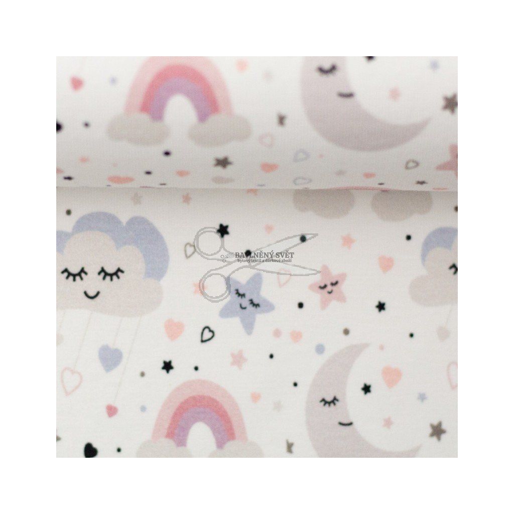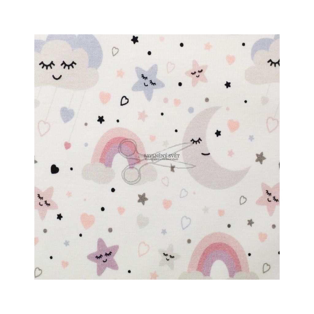 Jemný bavlněný úplet s příměsí elastanu okouzlí klidným dětským vzorem plným spících mráčků, měsíce, hvězdiček a duhy v pastelových odstínech. Látka je hebká na dotek, příjemná k pokožce a krásně pružná, takže se pohodlně nosí i těm nejmenším. Úplet je jako stvořený pro šití dětského a kojeneckého oblečení, například body, trička, legíny, pyžamka, čepičky nebo šatičky. Díky své prodyšnosti a měkkosti je vhodný i pro spánek a celodenní nošení. Motiv působí jemně a uklidňujícím dojmem, takže se skvěle hodí do dětského šatníku.
