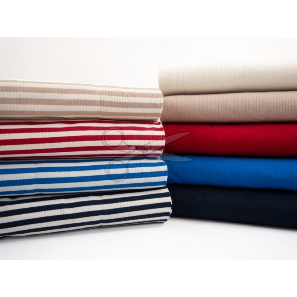 Žebrovaný úplet s modro-smetanovým pruhem v sobě spojuje klasický pruhovaný vzhled s lehce sportovním charakterem. Smetanový podklad zjemňuje výraznou modrou barvu a vytváří vyvážený, svěží vzor, který se skvěle hodí pro letní nošení a aktivní dny venku. Materiál je pružný, měkký a příjemný na těle, dobře odvádí teplo a poskytuje pohodlí i při celodenním nošení. Díky žebrované struktuře se látka přizpůsobí pohybu a drží tvar, což oceníte při šití triček, kraťasů, tílek nebo pohodlného oblečení vhodného například na vodácké výpravy, dovolené u vody či volnočasové aktivity.